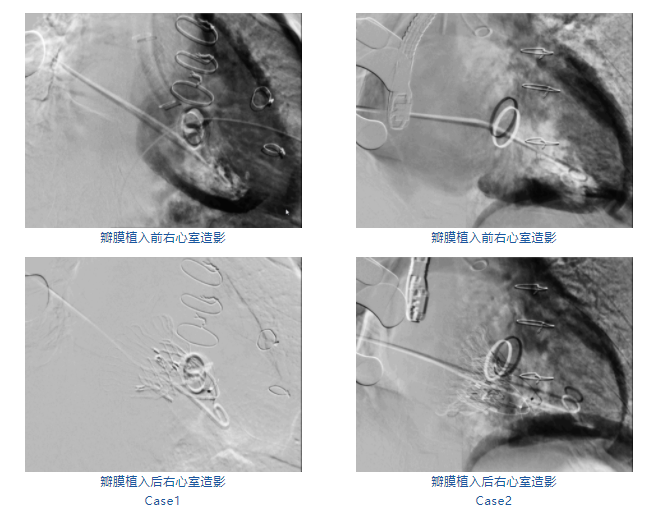 經右側胸部微小切口,郭惠明教授團隊將輸送器經右房路徑,通過三尖瓣順利送入右心室,在DSA及超聲指導下精準地控制輸送系統釋放瓣膜,在超聲和DSA確認無瓣周漏及瓣膜系統穩定性良好后進行室間隔錨定。2例瓣膜置換過程均僅耗時10分鐘,術后超聲和造影顯示瓣膜位置形態良好,幾乎無返流。