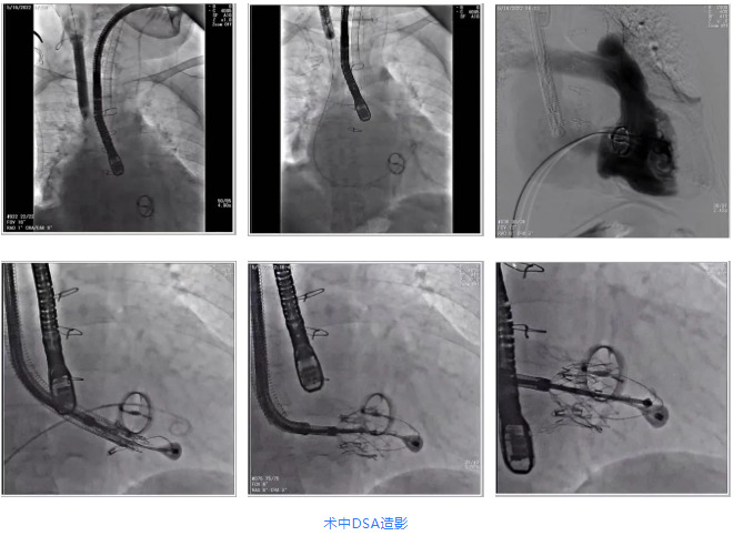 根據術前評估結果,郭應強教授團隊為患者量身定制了手術策略,決定使用LuX-Valve Plus經血管三尖瓣置換系統開展手術治療。手術在全麻下進行,采用經右側頸靜脈入路,在經食道超聲和DSA的指引下調整輸送器角度以達到正確位置,勾住前瓣后逐步釋放盤片,盤片打開后順利扎針,最終完成瓣膜植入,輸送器撤出。術后超聲提示人工三尖瓣同軸性良好,瓣架固定牢靠,無反流和瓣周漏,術后三尖瓣平均跨瓣壓差為1 mmHg。