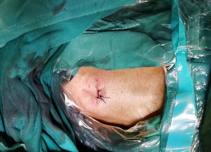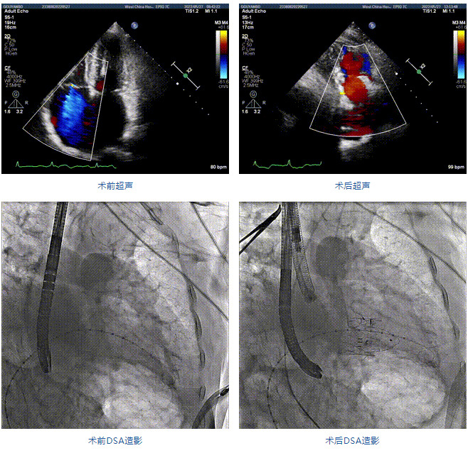 團隊前期經過多次討論,制定了周密的手術策略和預案。由于患者已是近九旬的超高齡老人,傳統外科開胸手術風險極高,純介入經血管三尖瓣替換能夠明顯減少創傷。術中陳茂及馮沅教授結合體表定位在造影指示下精準穿刺右側頸靜脈并預置兩把血管縫合器。成功建立經皮血管入路后在食道超聲和DSA的引導下順利完成人工瓣膜植入,術后超聲和造影顯示人工三尖瓣同軸性良好,瓣架固定牢靠,無反流和瓣周漏,平均跨瓣壓差降為1mmHg。術畢收緊預置的血管縫合器縫線完成止血,縫合效果滿意,在手術室即刻拔除氣管插管。