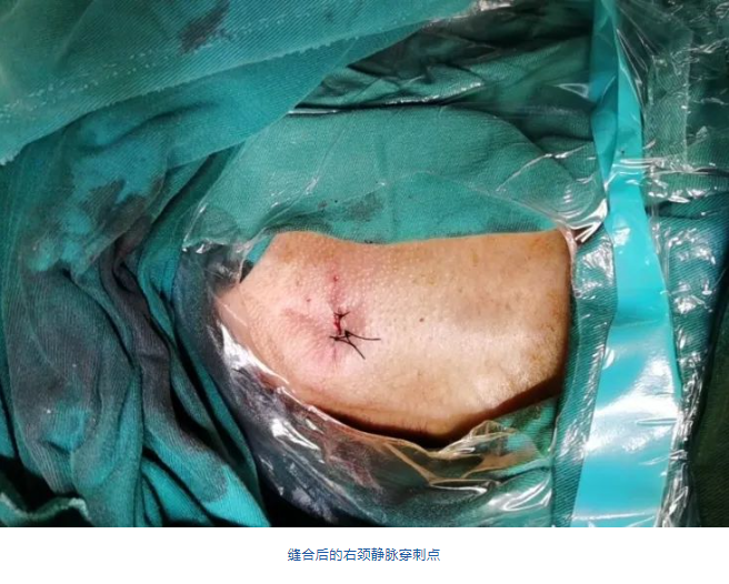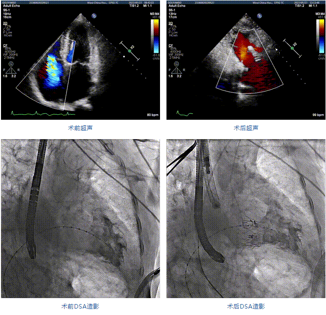 團隊前期經過多次討論,制定了周密的手術策略和預案。由于患者已是近九旬的超高齡老人,傳統外科開胸手術風險極高,純介入經血管三尖瓣替換能夠明顯減少創傷。術中陳茂及馮沅教授結合體表定位在造影指示下精準穿刺右側頸靜脈并預置兩把血管縫合器。成功建立經皮血管入路后在食道超聲和DSA的引導下順利完成人工瓣膜植入,術后超聲和造影顯示人工三尖瓣同軸性良好,瓣架固定牢靠,無反流和瓣周漏,平均跨瓣壓差降為1mmHg。術畢收緊預置的血管縫合器縫線完成止血,縫合效果滿意,在手術室即刻拔除氣管插管。
