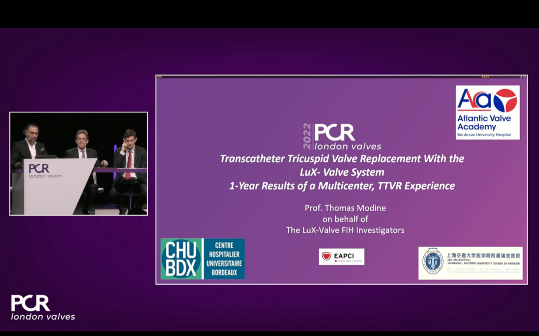 在本次大會上,法國波爾多大學醫院Thomas Modine教授公布了LuX-Valve FIM一年臨床數據,并線上指導德國Mainz中心Ralph Stephan von Bardeleben教授進行了其所在中心的LuX-Valve Plus首例植入。在亮眼的臨床數據與精彩的手術實踐結合中,與會專家充分感受到了三尖瓣介入領域中國原創器械的魅力。