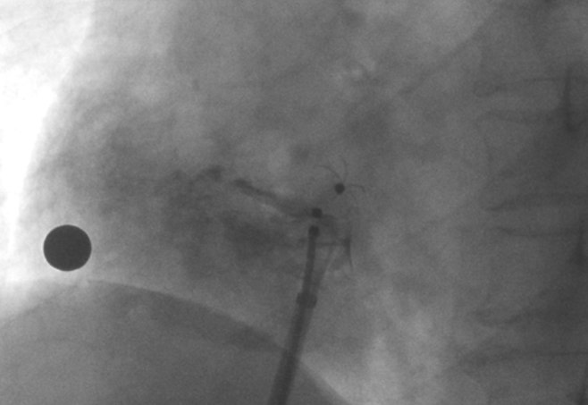 造影顯示PFO封堵完全,無殘余分流, 試驗器械充分舒展并貼合良好