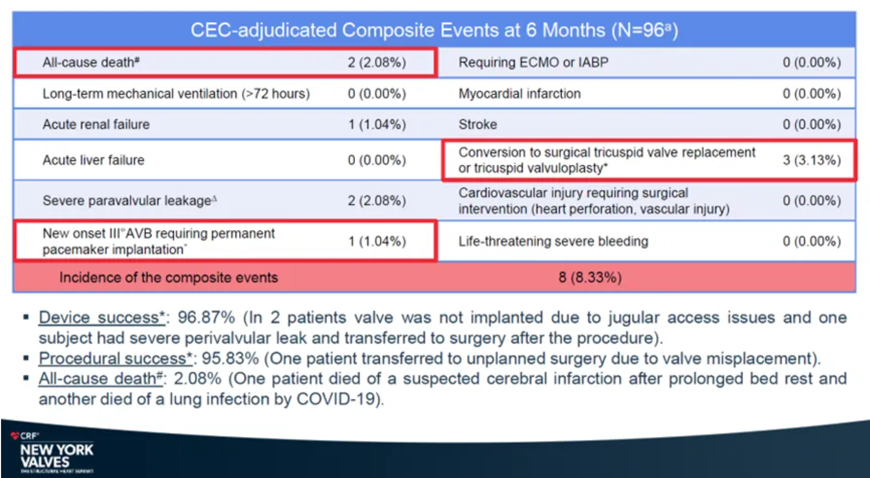 安全性結果顯示,復合事件發生率為8.33%。心梗、卒中、使用ECMO(體外膜肺氧合)或IABP(主動脈內球囊反搏)、急性肝功能衰竭、長期機械通氣(>72小時)、需要外科干預的心血管損傷(心臟穿孔、血管損傷)、危及生命的大出血事件發生率均為0%。全因死亡率僅為2.08%,急性腎臟衰竭、重度瓣周漏和中轉外科三尖瓣置換或成形術發生率分別為1.04%、2.08%和3.13%。新發III度房室傳導阻滯需植入永久心臟起搏器的發生率僅1.04%。