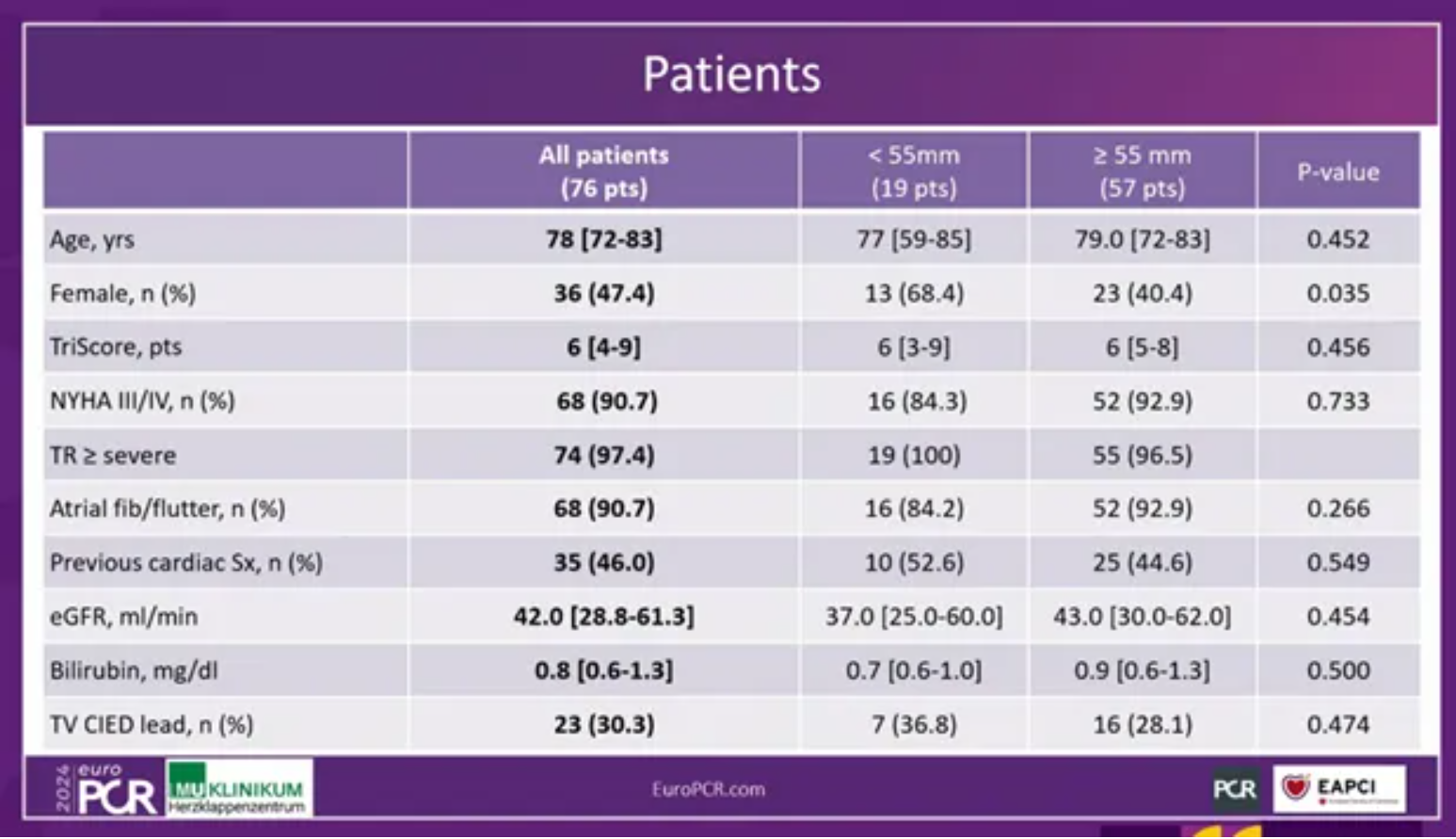 Hausleiter教授總結道,同情救治使用數據展現了經頸靜脈入路的LuX-Valve Plus系統對于反流等級的降低是安全有效的;而且對于小瓣環患者(<55mm)和大瓣環患者(≥55mm)具備可比較的意義,這意味著三尖瓣置換(TTVR)對于晚期三尖瓣反流并有著大尺寸右心室的患者是可行的。