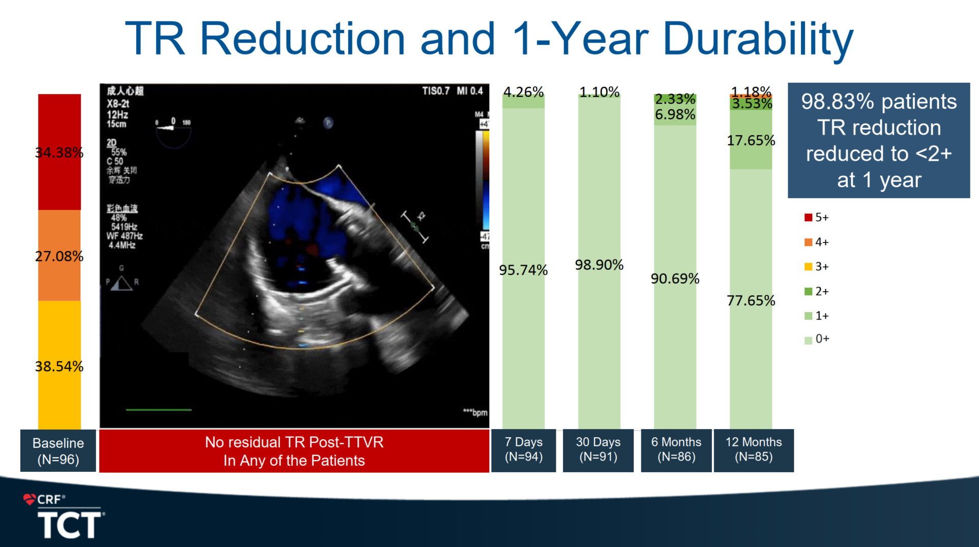 有效性結果顯示,患者的返流等級、心功能等級,以及生活質量顯著改善。所有受試者在30天顯示無中度及以上返流,95.30%的患者在1年期時顯示無中度及以上返流。同時,根據超聲數據顯示,患者右心系統重構也獲得受益。