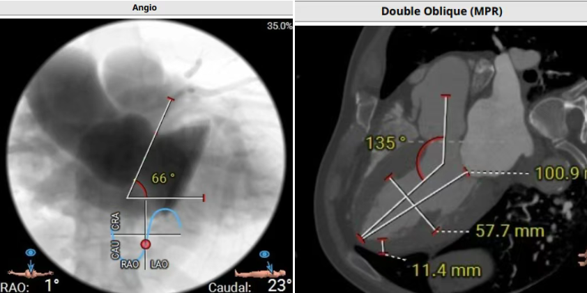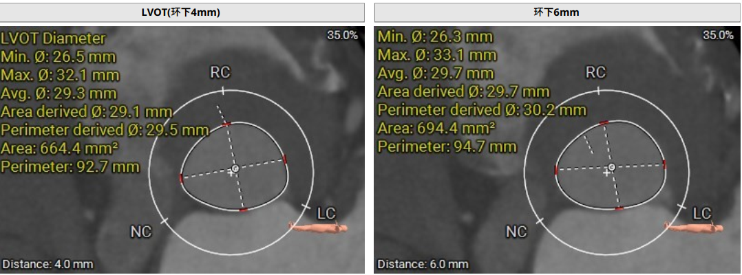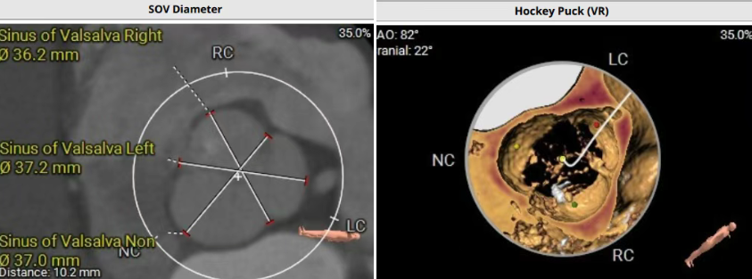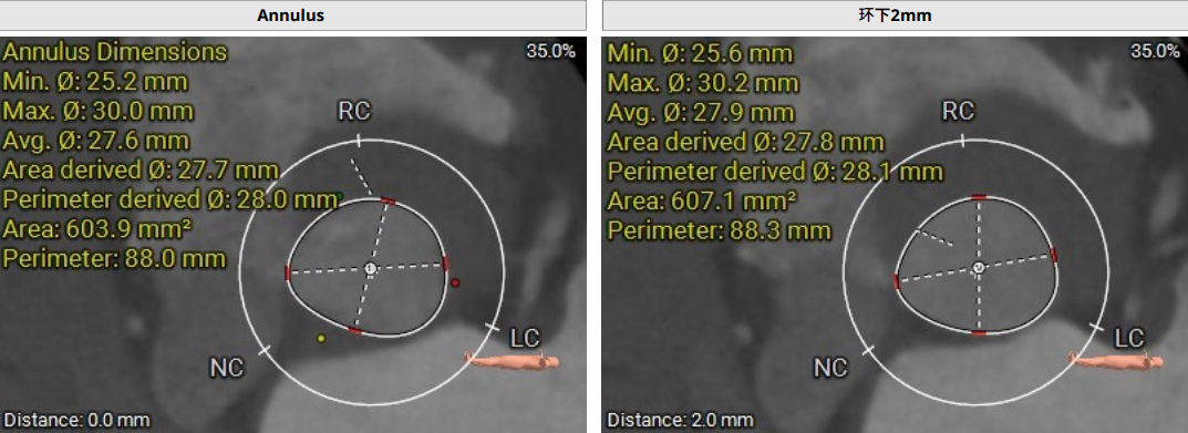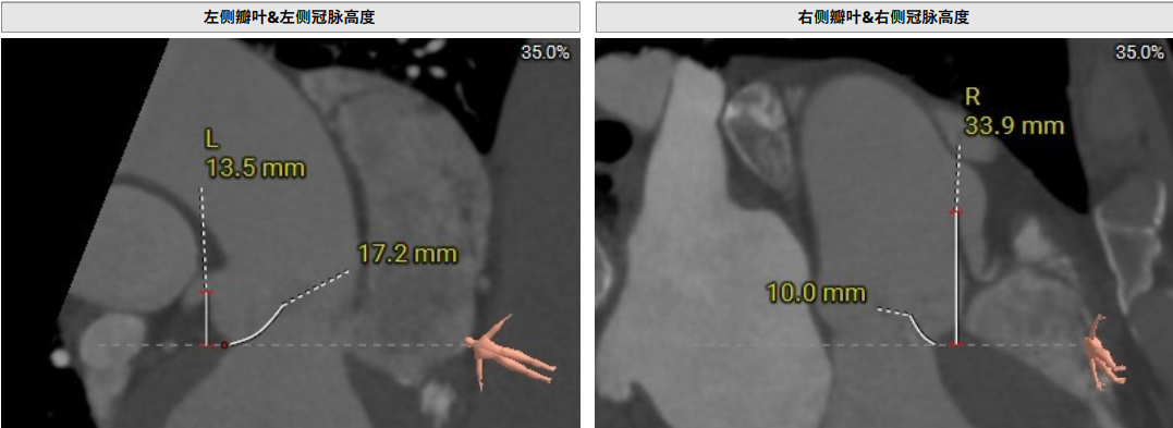 術前CT評估提示,患者主動脈瓣三葉瓣,瓣葉增厚,舒張期右冠瓣脫垂,右冠瓣瓣葉輕度鈣化,存在三個瓣竇,分布較均勻;主動脈瓣環周長折算直徑28.0mm;左心室流出道周長折算直徑29.5mm,無鈣化,無狹窄;STJ直徑35.3mm,升主動脈直徑41.8mm;雙側冠脈開口高度可LCA13.5mm ,瓣葉長17.2mm;RCA33.9mm,瓣葉長10.0mm;側左冠脈輕度鈣化;橫位心,左室主動脈夾角為135°;
